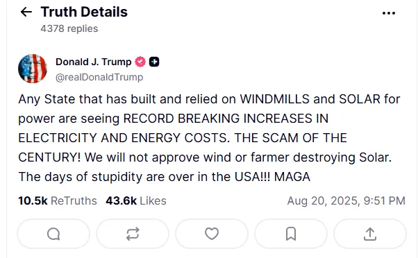 当地时间周三,美国总统特朗普在Truth Social平台发文称:任何建造并依赖风力发电和太阳能发电的州,电力和能源成本都出现了创纪录的增长。这是世纪大骗局!我们不会再批准破坏农田的风电或光伏项目,愚蠢的时代在美国已经结束了!