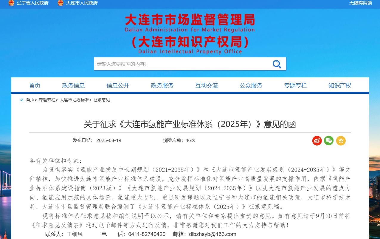 近日,大连市市场监督管理局发布关于征求《大连市氢能产业标准体系(2025年)》意见的函。