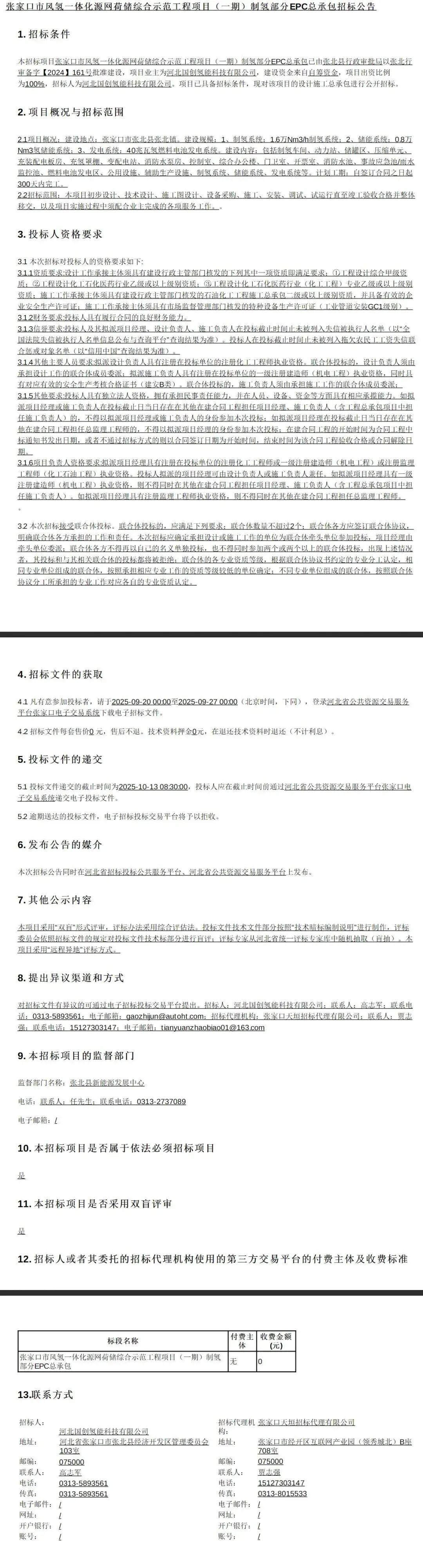 9月19日,张家口市风氢一体化源网荷储综合示范工程项目(一期)制氢部分EPC总承包招标公告。