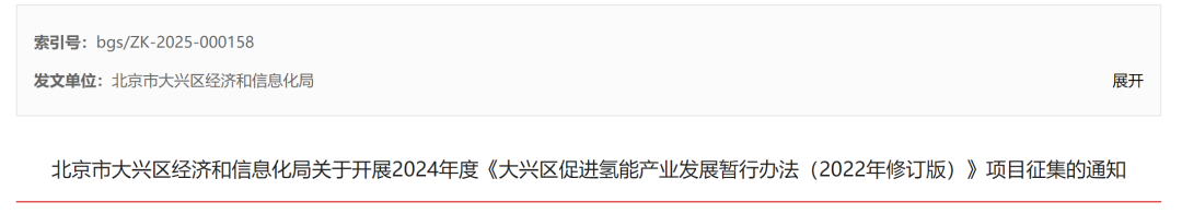 10月31日,北京大兴区经信局在北京政府官网发布了《关于开展2024年度<大兴区促进氢能产业发展暂行办法(2022年修订版)>项目征集的通知》。