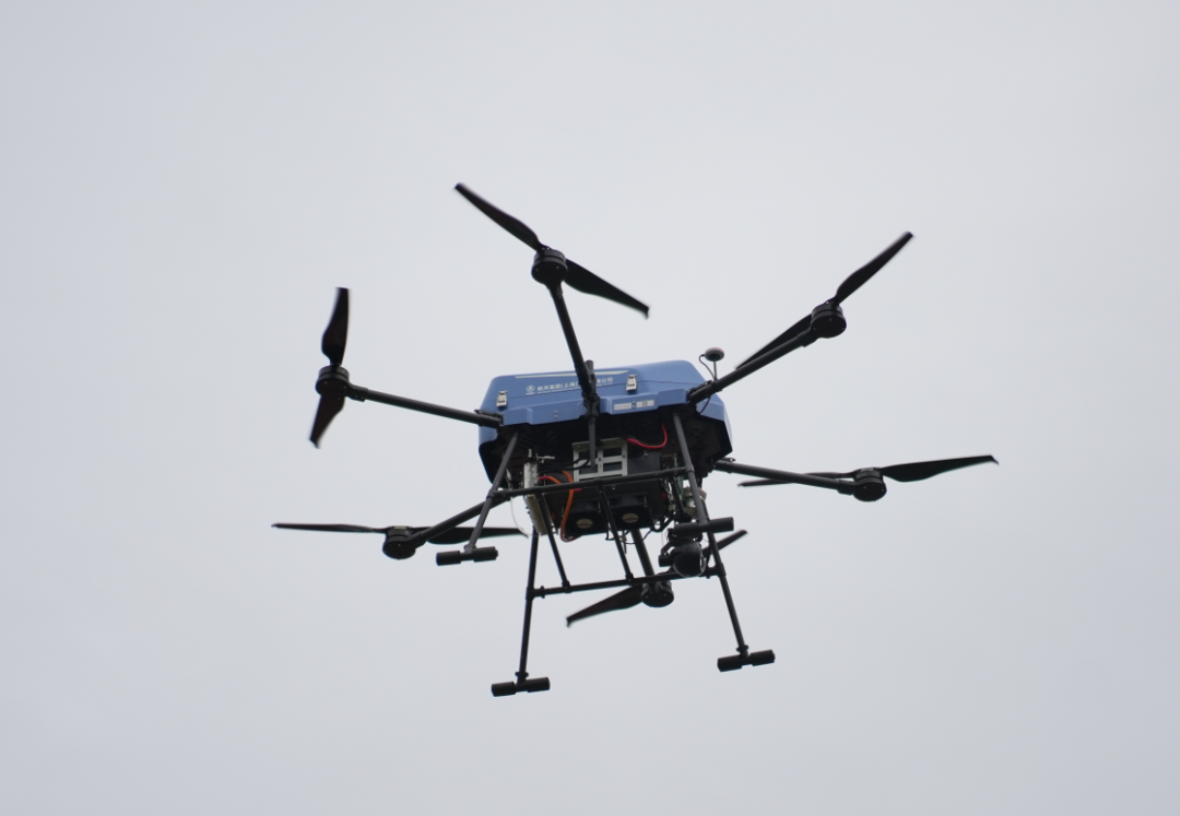 伴随着引擎轻鸣声,一架蓝色氢能无人机从起飞坪平稳升空,完成一键升起、360度自旋悬停、高清变焦、智能跟随、红外拍摄、定点飞行等6项核心飞行项目。