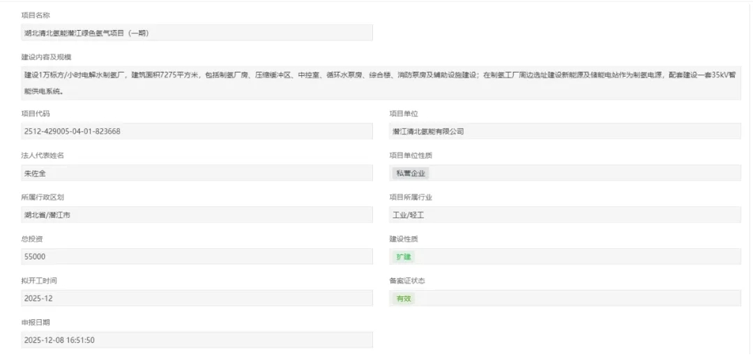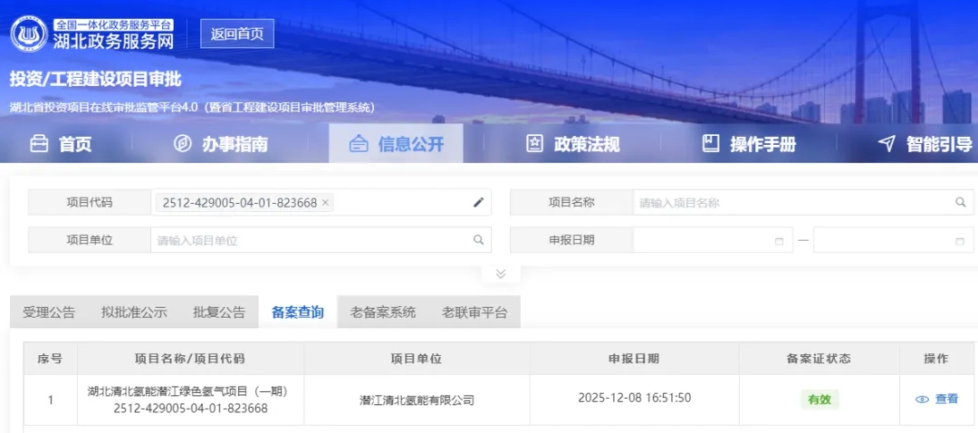 据湖北政务服务网消息,12月8日,湖北清北氢能潜江绿色氢气项目(一期)项目通过备案。