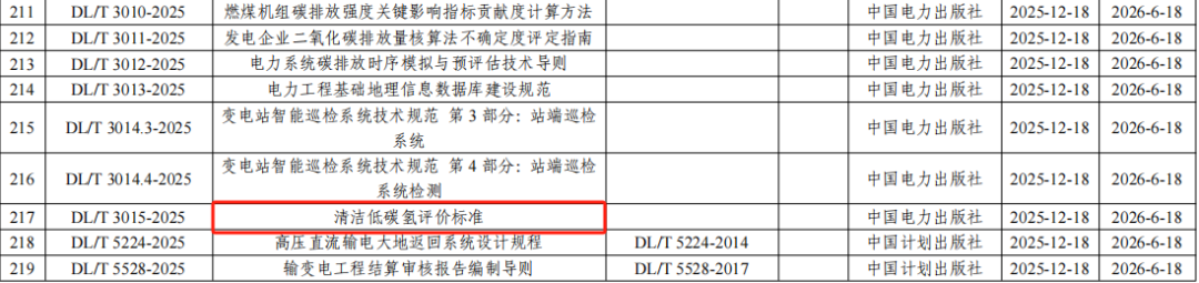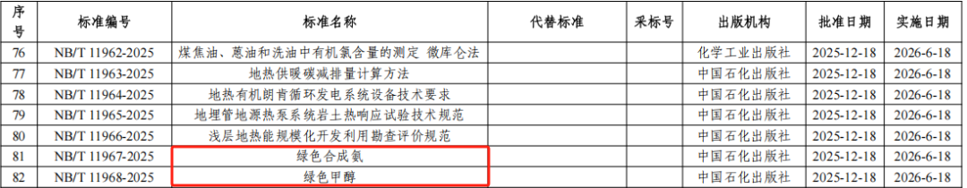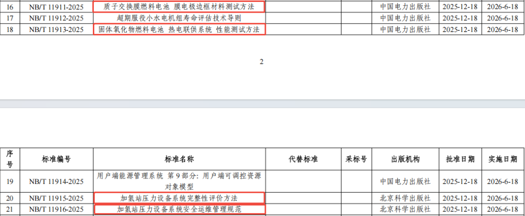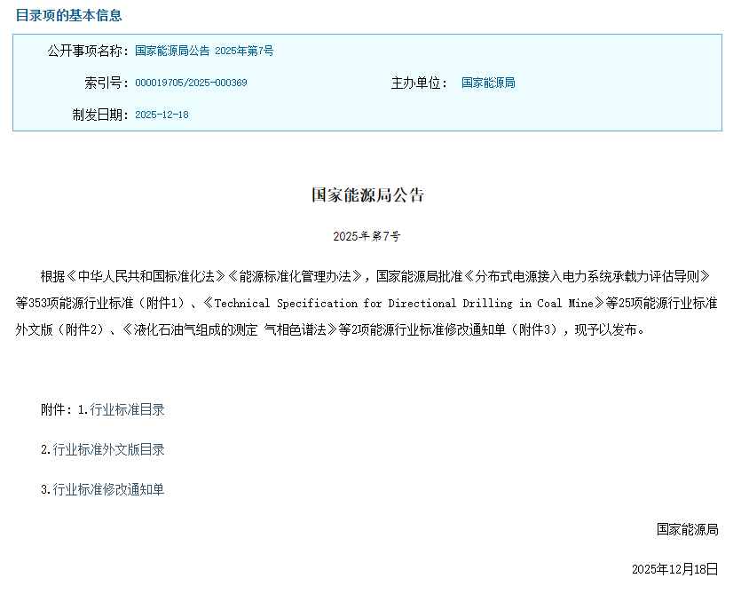 12月30日,国家能源局发布2025年第7号公告,国家能源局批准《分布式电源接入电力系统承载力评估导则》等353项能源行业标准、《Technical Specification for Directional Drilling in Coal Mine》等25项能源行业标准外文版、《液化石油气组成的测定 气相色谱法》等2项能源行业标准修改通知单,现予以发布。其中氢能相关包括:质子交换膜燃料电池 膜电极边框材料测试方法、固体氧化物燃料电池 热电联供系统 性能测试方法、加氢站压力设备系统完整性评价方法、加氧站压力设备系统安全运维管理规范、清洁低碳氢评价标准、绿色合成氨、绿色甲醇。