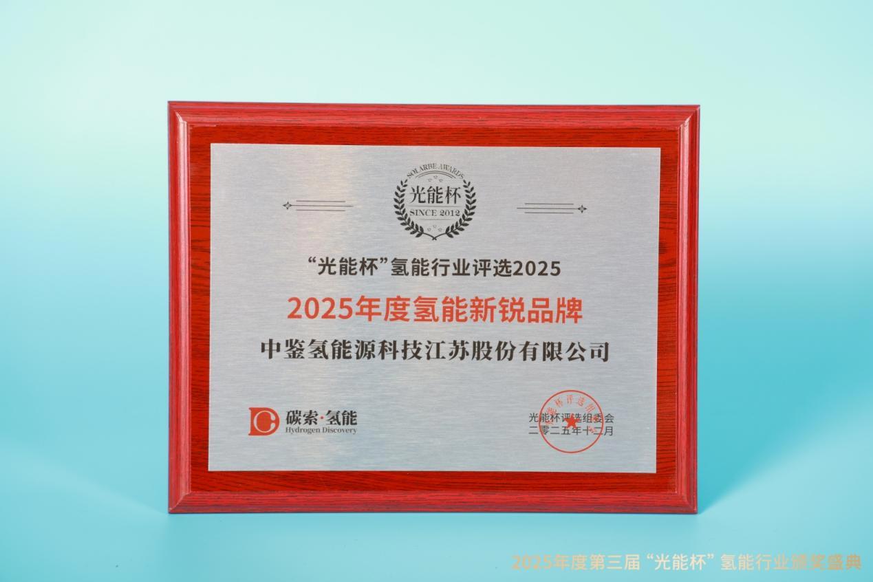 2026年1月14日,由碳索氢能主办的2025年度“光能杯”氢能行业颁奖盛典在苏州圆满落幕。本届“光能杯”共揭晓七个奖项类目,覆盖制氢装备、材料部件、氢能下游应用等细分领域。中鉴氢能源科技江苏股份有限公司(简称“中鉴氢能”)斩获“2025年度氢能新锐品牌”奖。